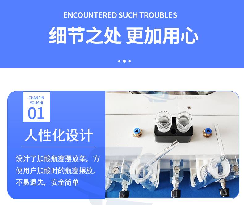 9、垂直加酸,加酸單元與反應瓶采用磨口垂直連接;加酸單元的調節旋鈕采用聚四氟乙烯材質防止酸堿液體腐蝕。